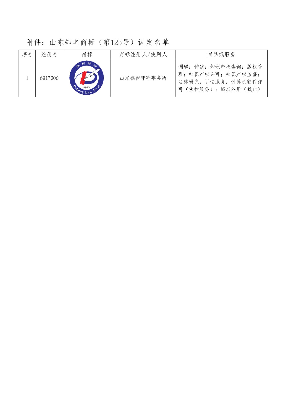 关于认定山东知名商标(第125号)的公告
