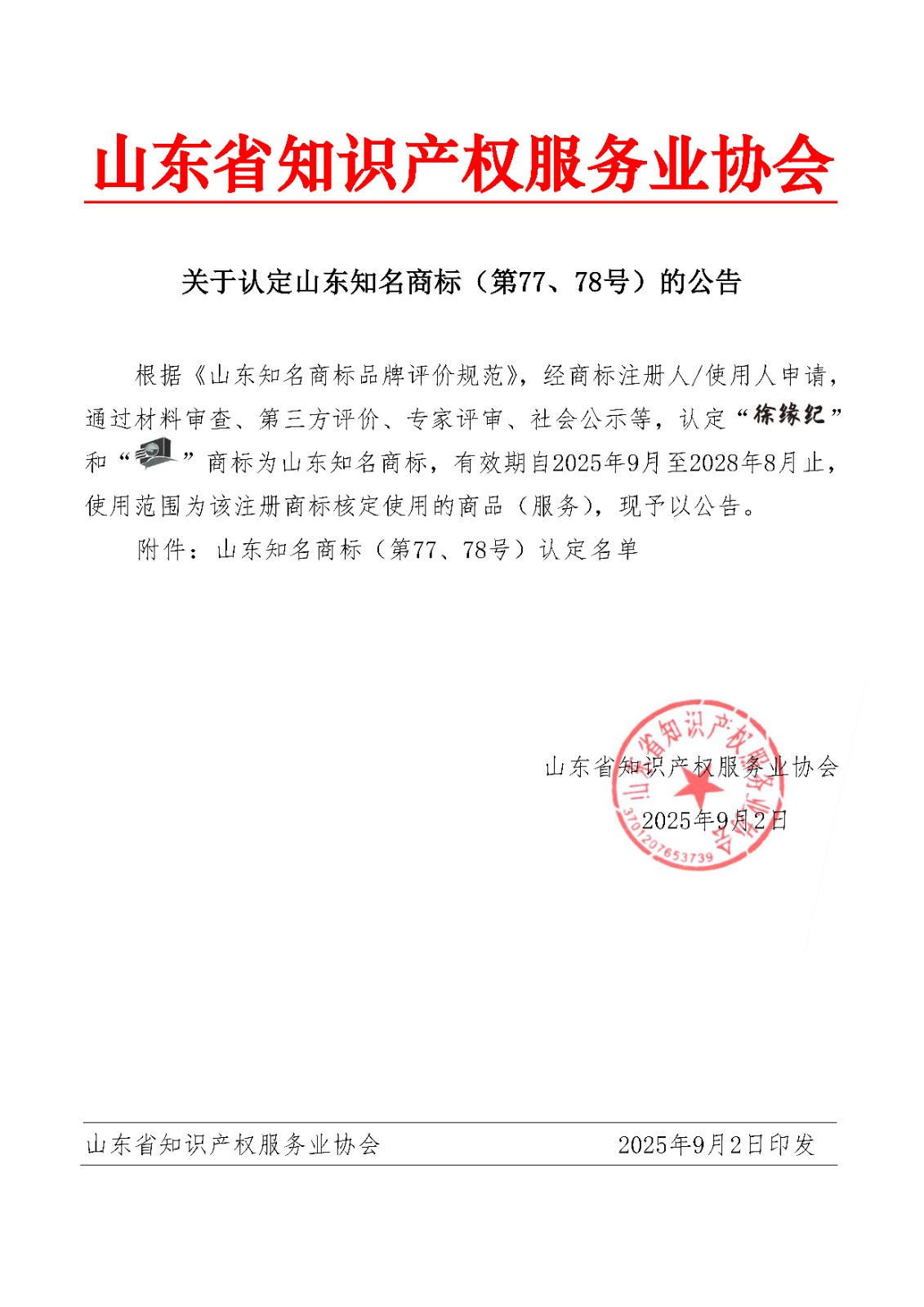 > 关于认定山东知名商标(第77、78号)的公告