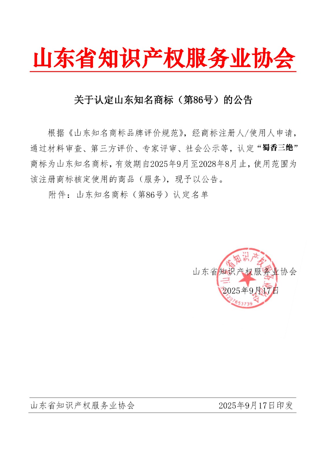 > 关于认定山东知名商标(第86号)的公告