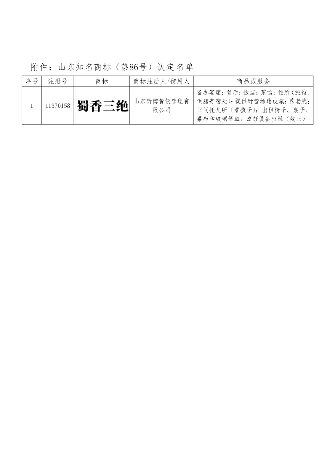 关于认定山东知名商标(第86号)的公告