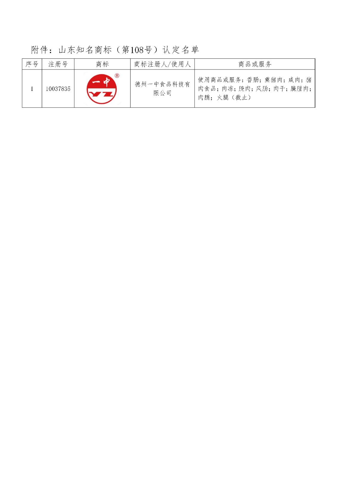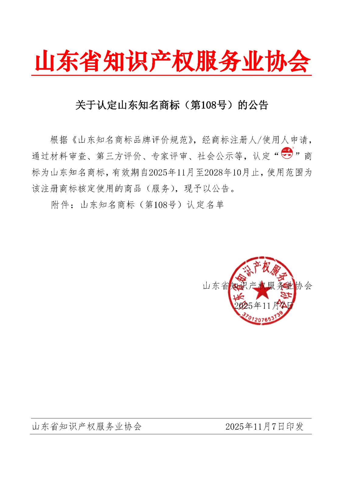 关于认定山东知名商标(第108号)的公告