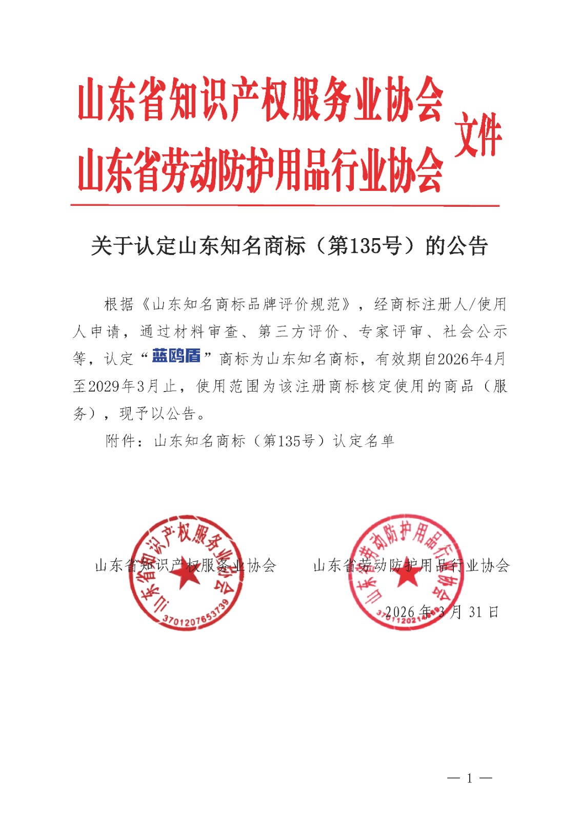 > 关于认定山东知名商标(第135号)的公告