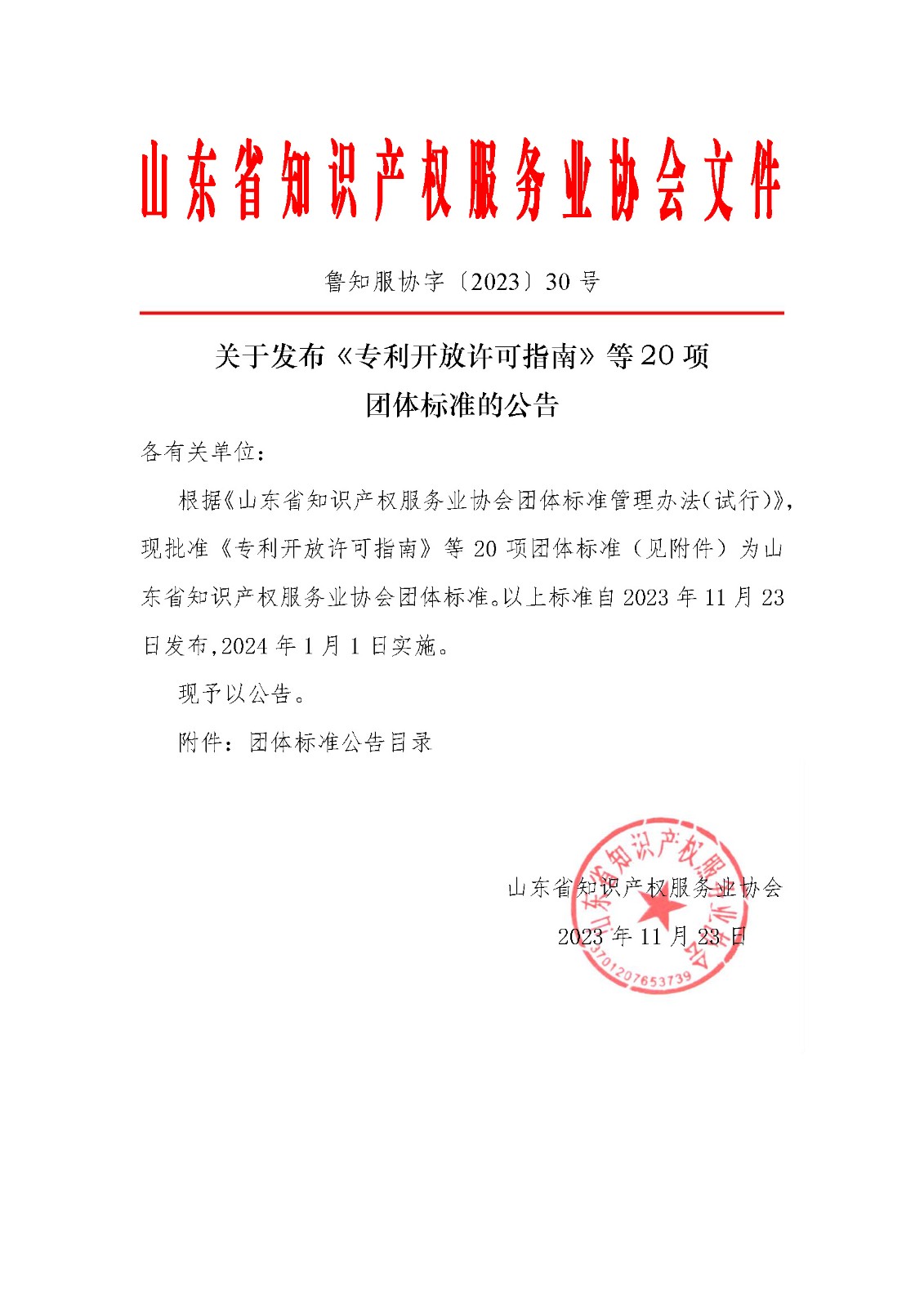 关于发布《专利开放许可指南》等20项团体标准的公告